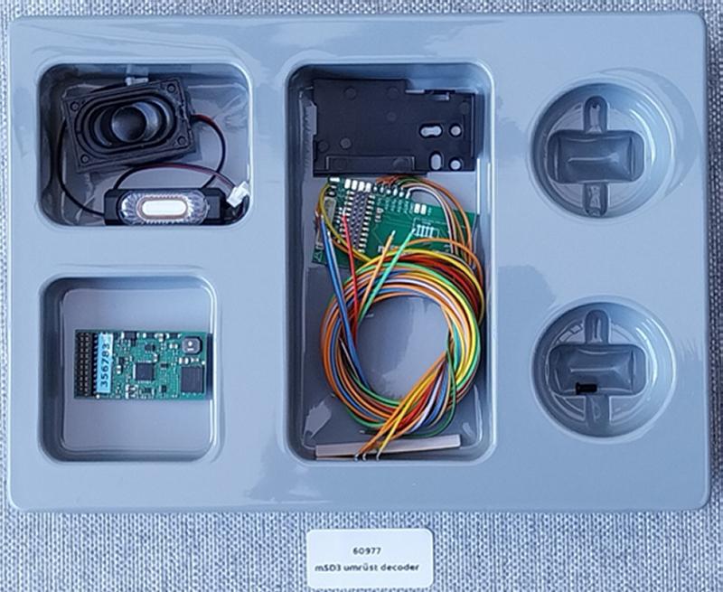 In mijn situatie heb ik gekozen voor artikelnummer 60977, een Märklin SoundDecoder mSD3 E-lok-Geräusch. Dit is een complete kit, waarvan ik alleen de decoder gebruik, de rest van het spul is voor reserve voor...later...of nooit...